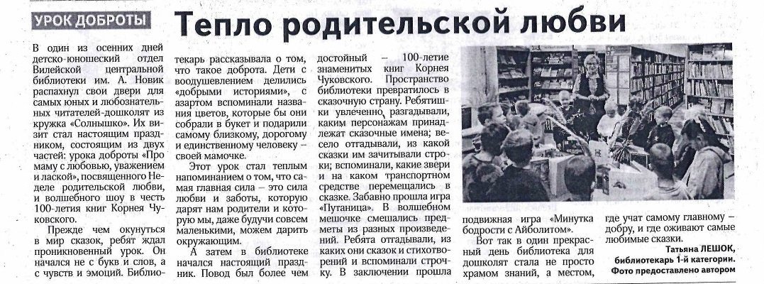 В честь этого события в детско-юношеском отделе ГУК «Вилейская районная центральная библиотека им. А. Новик» 22 октября была проведена конкурсно-развлекательная программа «Я похож на тебя», участниками которой стали воспитанники ГУО «Детский сад № 8 г. Вилейки».