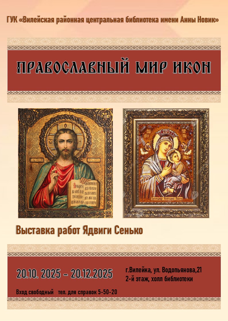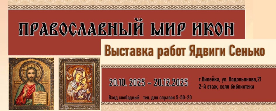 villib Дорогие друзья! Приглашаем всех ценителей духовного искусства на персональную выставку художницы Ядвиги Ивановны Сенько «Православный мир икон». На выставке представлены 24 уникальные работы – списки с известных в православном мире икон, выполненные художницей по благословению Филарета митрополита Минского и Слуцкого Патриаршего Экзарха всея Беларуси.