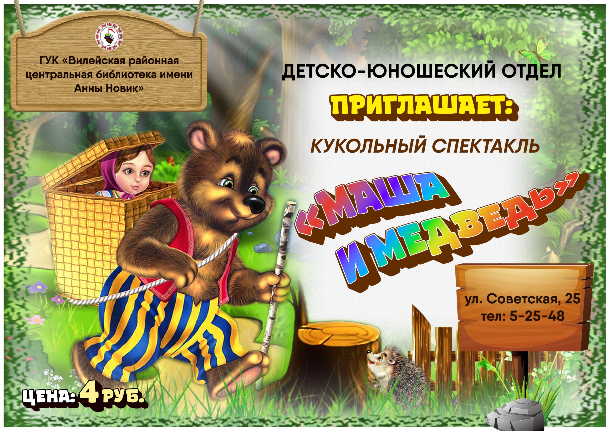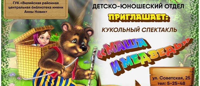 villib Дорогие ребята! Спешим поделиться радостной новостью: в детско-юношеском отделе районной центральной библиотеки возобновляется показ кукольного спектакля «Маша и медведь», который подготовил для вас самодеятельный кукольный театр «Колобок» по мотивам одноименной русской народной сказки. Вас ждет увлекательное представление и любимые сказочные персонажи! Приглашаем в библиотеку за незабываемыми эмоциями и отличным настроением! Ждем вас по адресу: ул. Советская, д. 25.