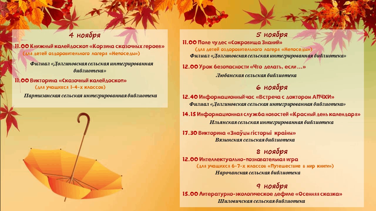 Уважаемые ребята! Вот и подошла к концу первая четверть, а впереди – долгожданные осенние каникулы. Библиотеки Вилейского района приглашают вас провести это время интересно и с пользой! Мы подготовили для вас разнообразную программу мероприятий, которая точно не даст вам заскучать! Приходите вместе с друзьями! Мы поможем сделать каникулы яркими и незабываемыми!