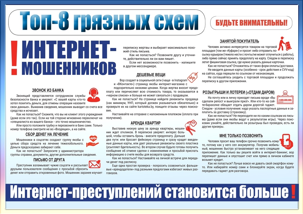 Это не все, но самые актуальные и распространенные схемы, и со временем они могут меняться. Чтобы не стать жертвой киберпреступников, необходимо всегда адекватно оценивать свои действия и как бы вас не запугивали, не поддаваться панике и страху. Будьте бдительны и берегите свои деньги!