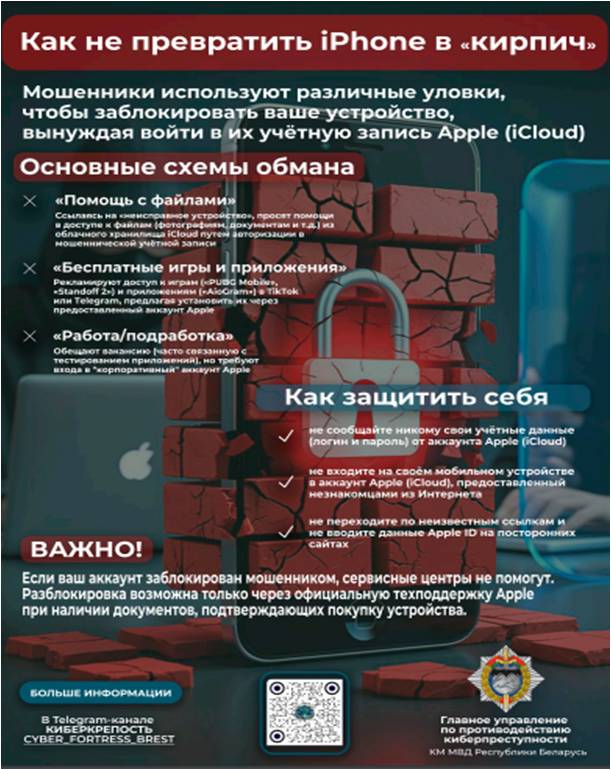 Одним из новых, набирающих обороты, способов является вымогательство за разблокировку Iphone. Вначале аферист в переписке узнает о наличии Iphone у будущей жертвы, а потом под различными предлогами убеждает войти в его ICloud. Предлогами могут быть, например, помощь в восстановлении фотографий, сохранение диплома, возможность пройти уровень в игре или получить для своего героя игровое имущество, оружие или способность. После входа в ICloud мошенника, Iphone жертвы блокируется. Для его разблокировки предлагается заплатить сумму, в зависимости от модели, превышающую 1000 рублей.