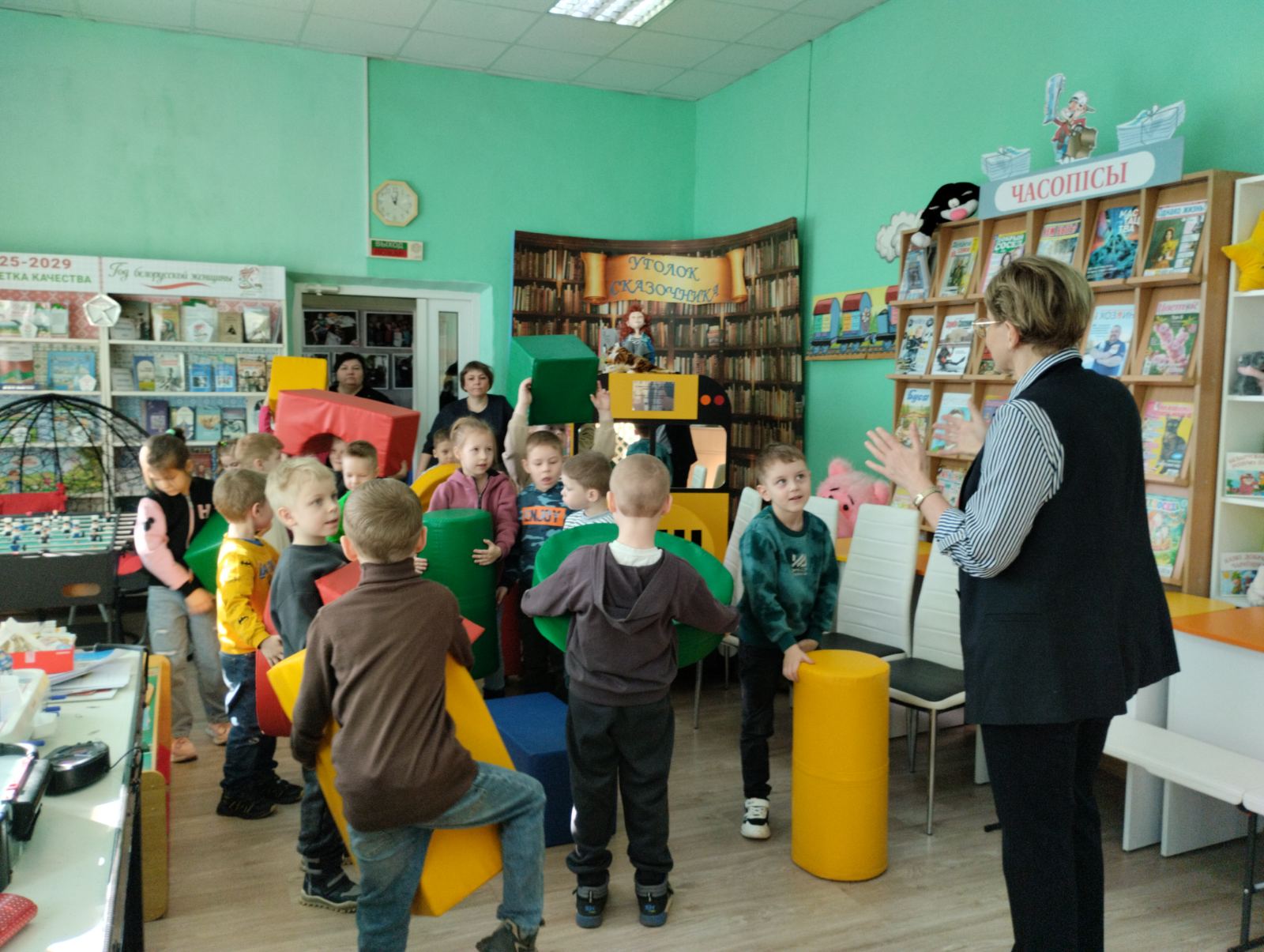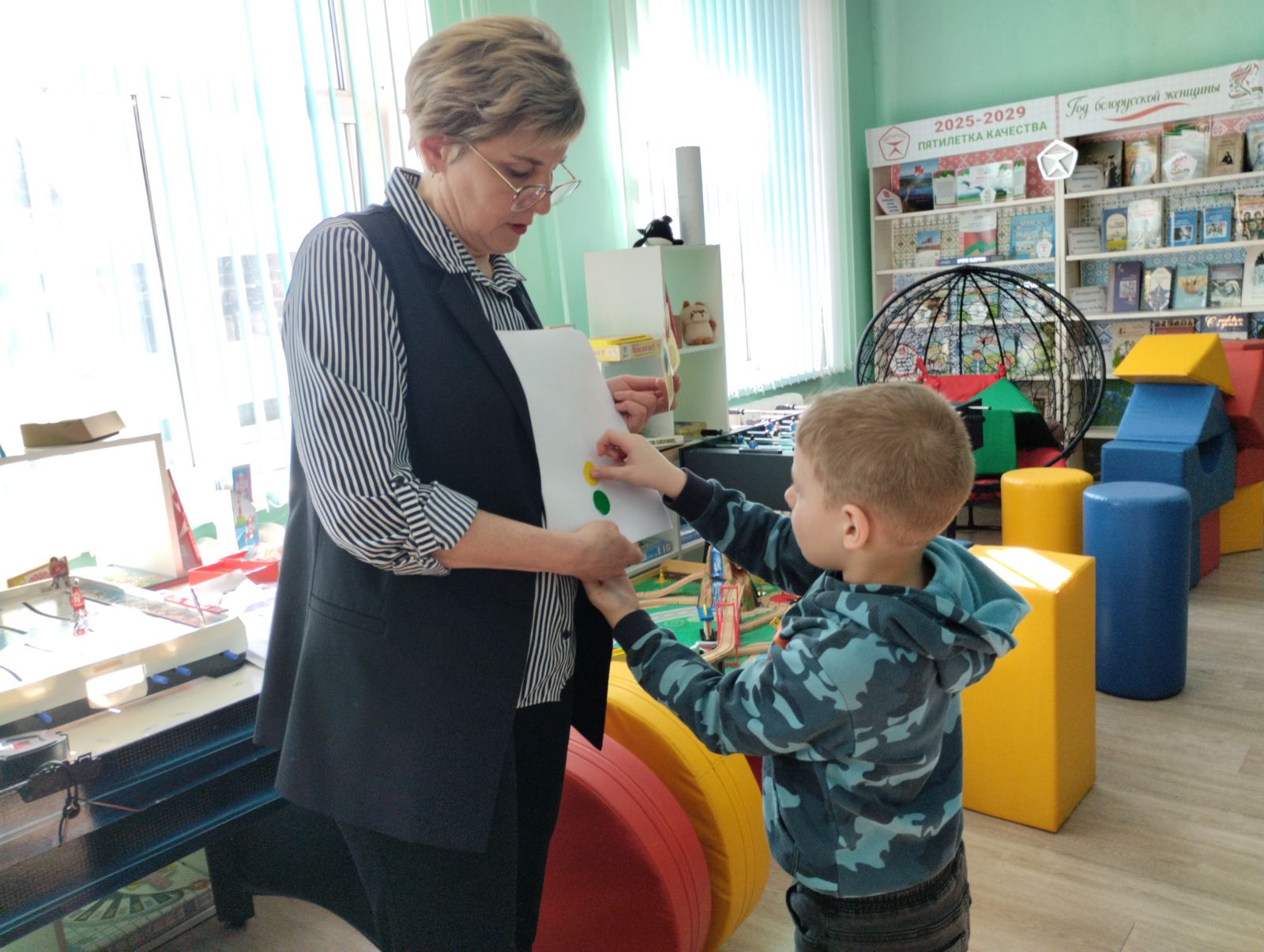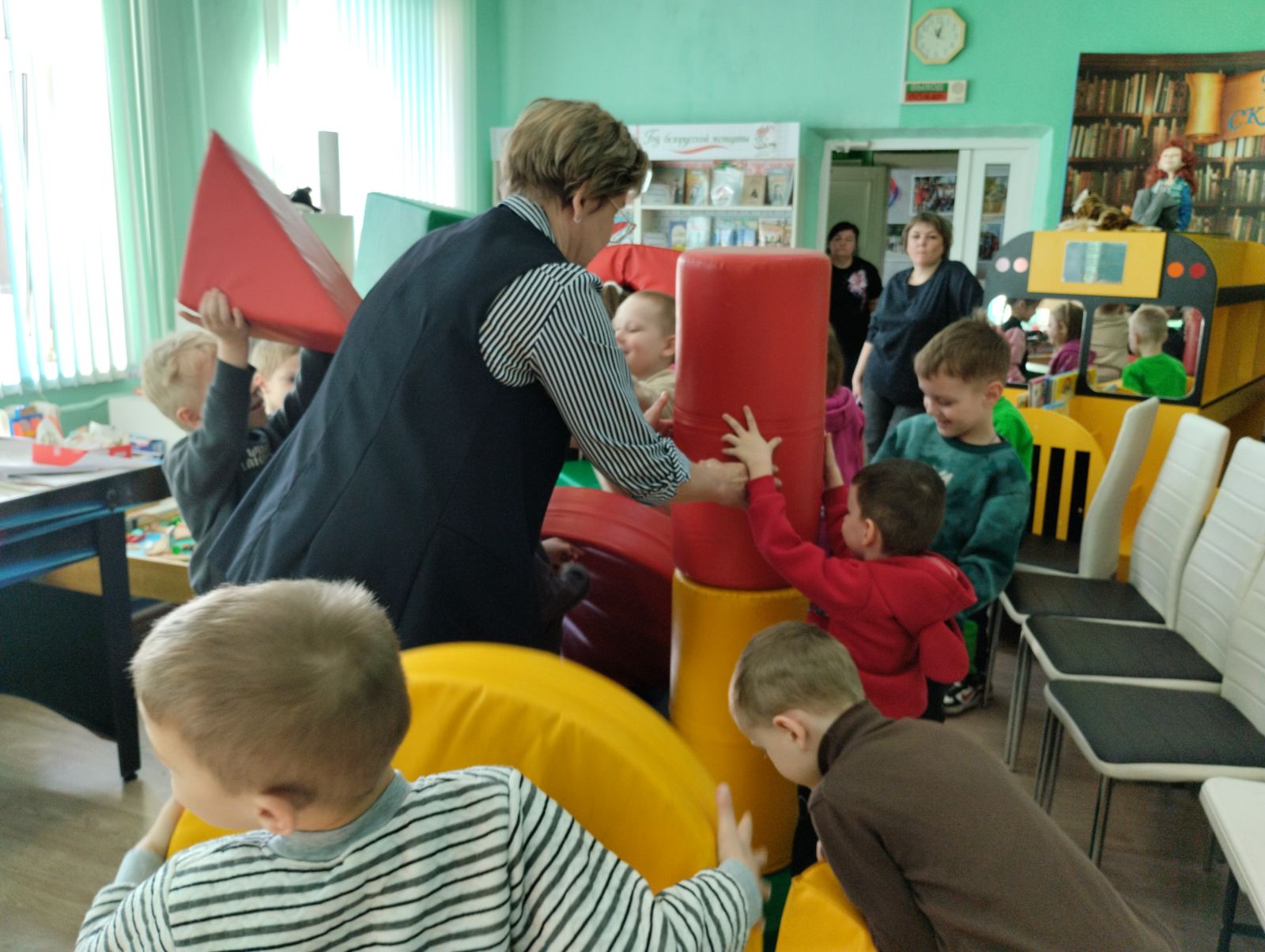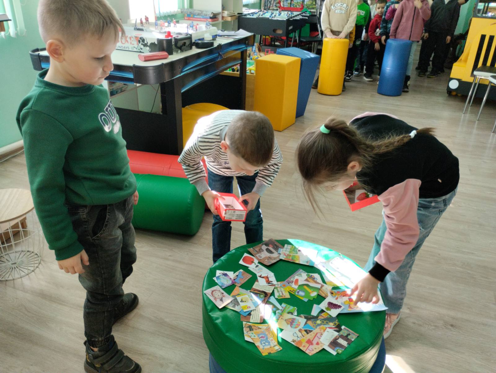 Разрядить обстановку после активных заданий помогла подвижная игра «Светофор». Детям выдали мягкие модули красного, желтого и зеленого цвета. По команде ведущего ребята должны были быстро находить друг в друга и строиться в тройки, точно соответствующие цветам светофора.