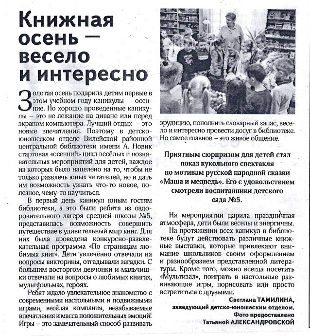 villib Золотая осень подарила детям первые в этом учебном году каникулы – осенние. Но хорошо проведенные каникулы проходят не на диване или за экраном компьютера. Лучший отдых – это новые впечатления. Поэтому в детско-юношеском отделе ГУК «Вилейская районная центральная библиотека им. А.Новик» стартовал «осенний» цикл весёлых и познавательных мероприятий для детей, каждое из которых было нацелено на то, чтобы не только развлечь юных читателей, но и дать им возможность узнать что-то новое, полезное, чему-то научиться.