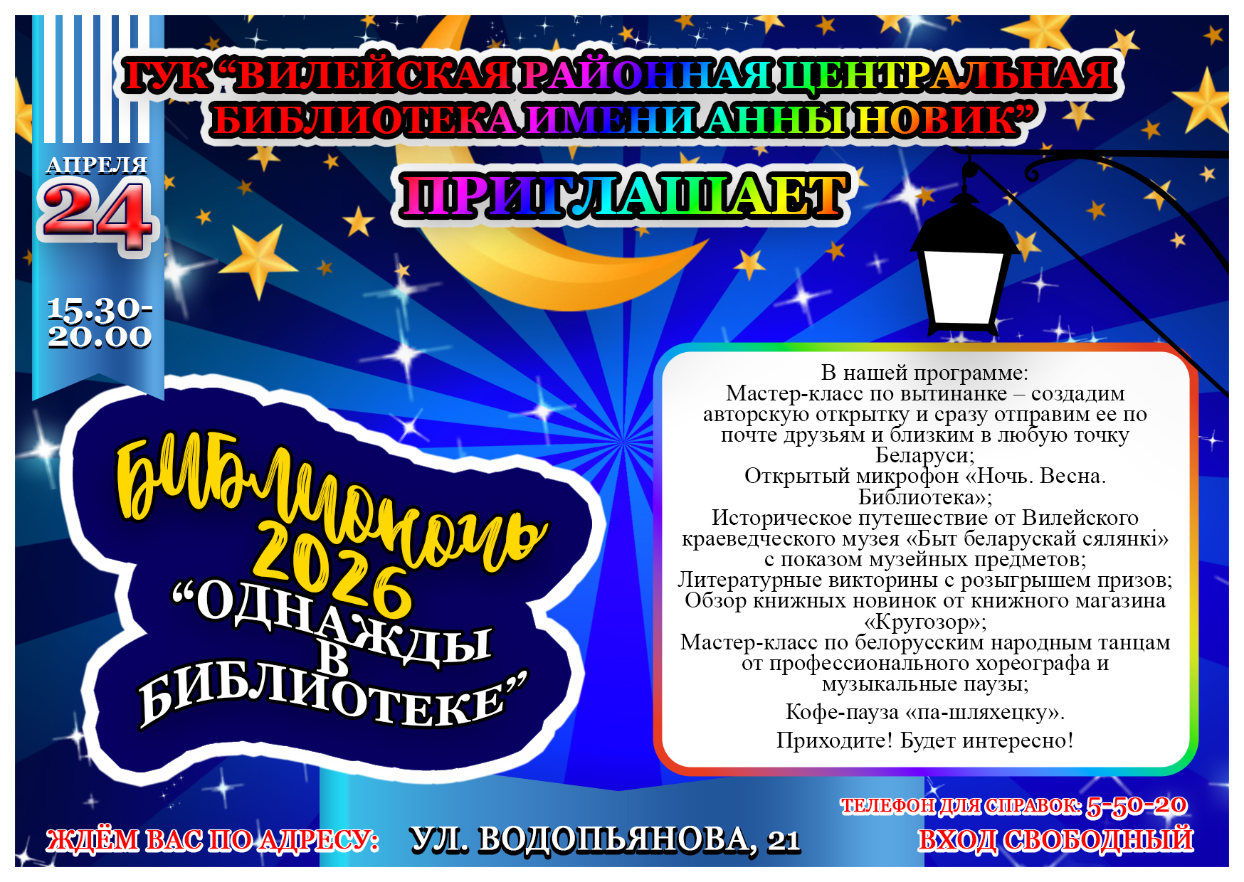 villib 24 апреля в отделе обслуживания и информации ГУК «Вилейская районная центральная библиотека им. А. Новик» прошла ежегодная акция «Библионочь – 2026», подарившая гостям незабываемый вечер под интригующим названием «Однажды в библиотеке».