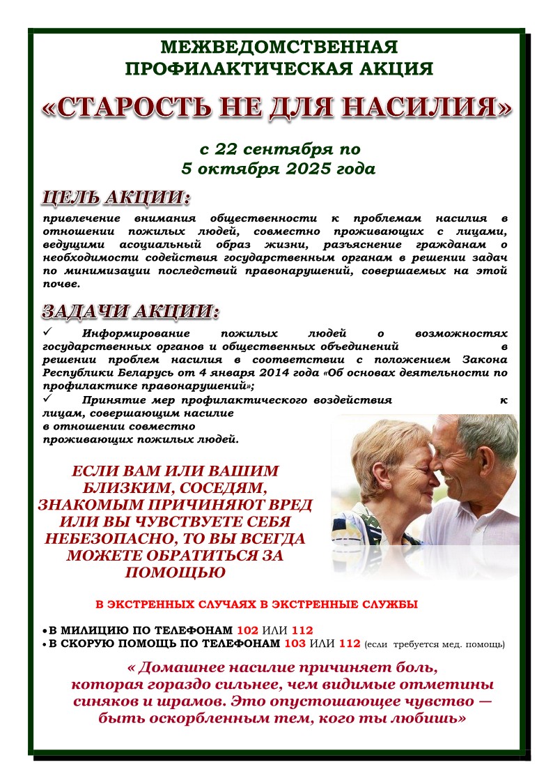 С 22 сентября по 5 октября 2025 года на территории Минской области пройдет межведомственная профилактическая акция «Старость не для насилия». Цель акции: привлечение внимания общественности к проблемам насилия в отношении пожилых людей, совместно проживающих с лицами, ведущими асоциальный образ жизни, разъяснения гражданам необходимости содействия государственным органам в решении задач по минимизации последствий правонарушений, совершаемых на этой почве.