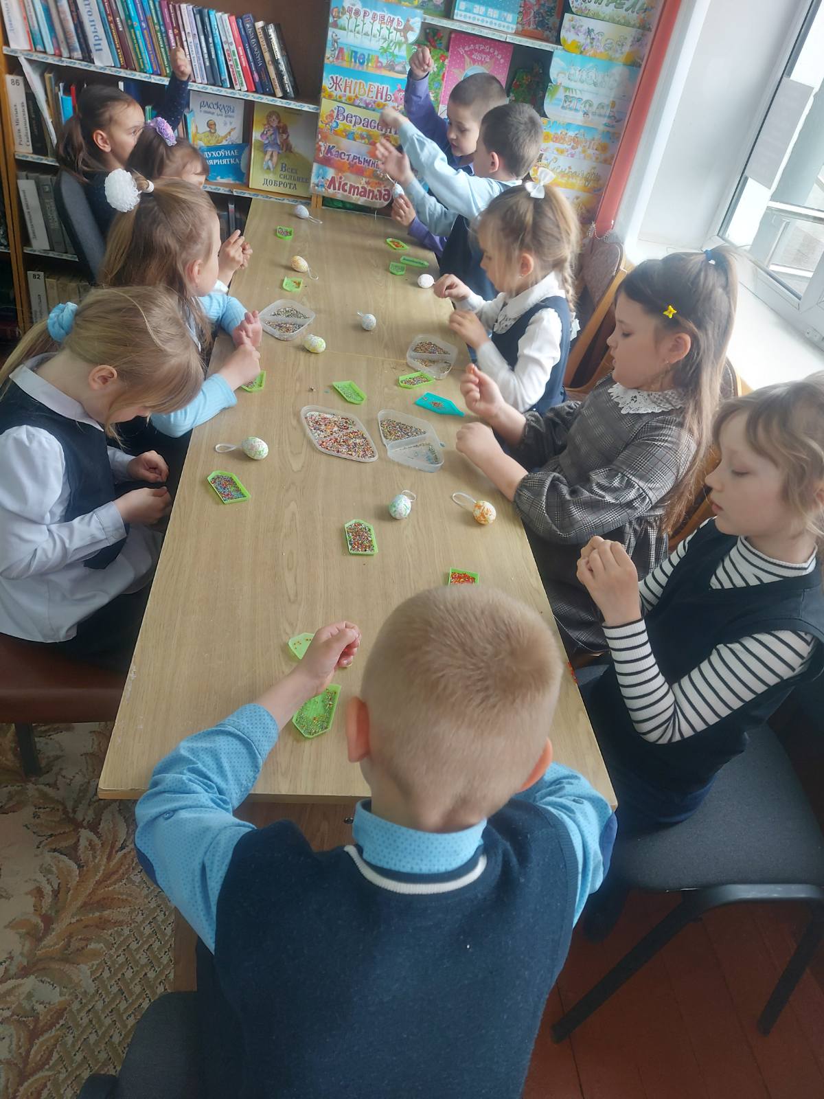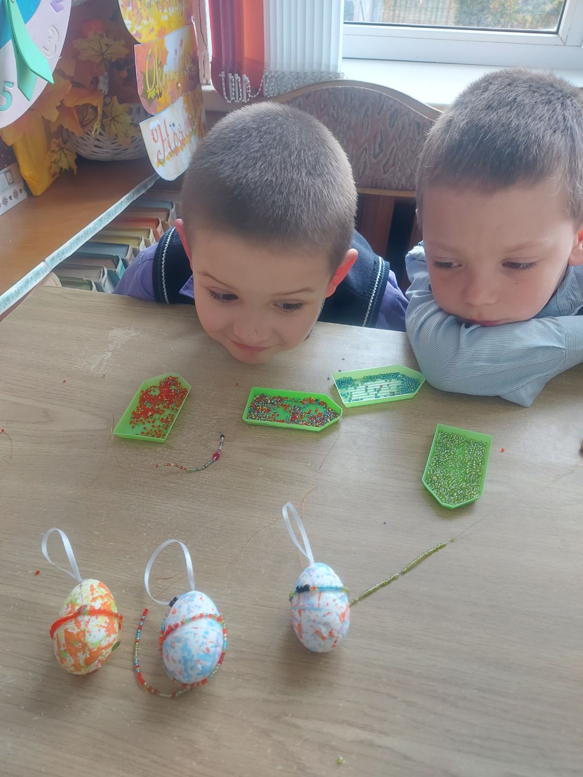 В этот раз перед участниками стояла непростая, но очень интересная задача – украсить пасхальные яйца разноцветным бисером, стараясь повторить изящество легендарных ювелирных шедевров. Ребята подошли к работе с фантазией, и в результате усердной работы у каждого ребенка получилось уникальное сувенирное пасхальное яйцо.