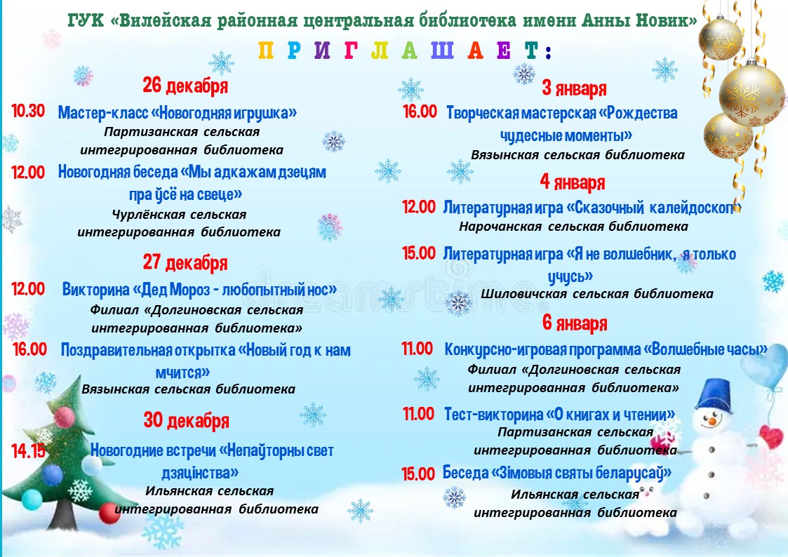 Мы подготовили для вас увлекательную программу мероприятий, которая точно не даст вам заскучать! Игры, мастер-классы, викторины, творческие мастерские, конкурсно-игровые программы и многое другое подарят вам отличное новогоднее настроение и массу незабываемых, ярких эмоций! Давайте проведем эти каникулы не только весело, но и с пользой!
